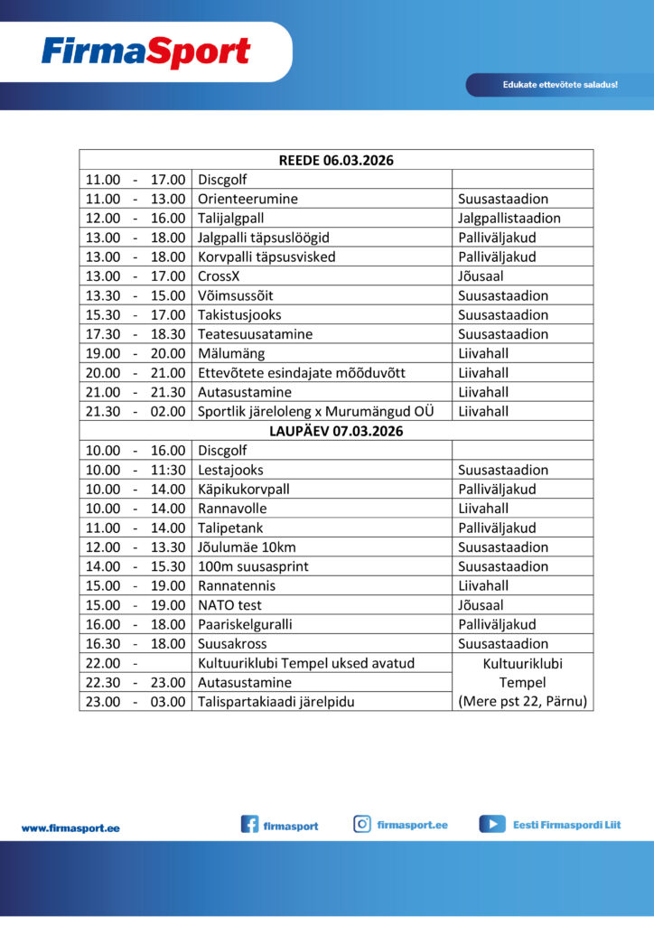 SAMM 2 – Et me teaksime, kes millisel alal osaleb, tuleb ettevõtte esindajal alla laadida ja täita Talispartakiaad’26-Nimeline-registreerimisleht ning saata see hiljemalt 27. veebruariks kell 17.00 e-postile sekretariaat@firmasport.ee